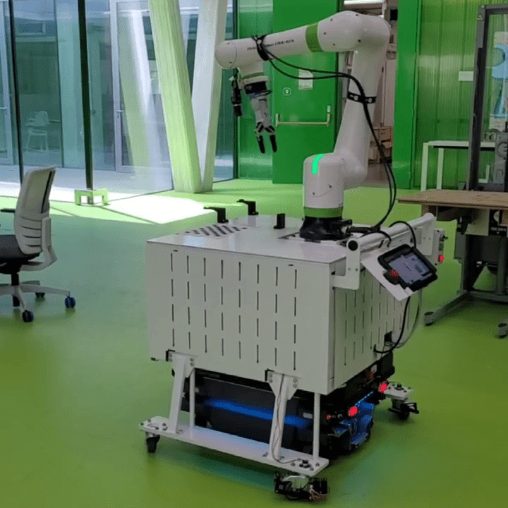 - development of a collaborative mobile manipulator able to perform logistic and assembling tasks; the mobile robot (AMR) and the collaborative robot (cobot) can work as a single robotic system or as two different entities; to this purpose, it is necessary a suitable coupling and decoupling system;
