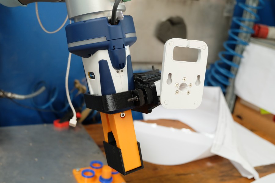 The UR5 arm is equipped with a collaborative electrical gripper by Schunk with 3D-printed fingers and a force/torque sensor by Nordbo Robotics mounted at the wrist to measure wrenches exchanged with the external environment. The UR5e, instead, comes with an integrated force/torque sensor inserted in its terminal joint, so it is only provided with a cordless suction gripper. Both arms can be additionally equipped with a custom 3D-printed support for a generic smartphone to provide sight to the robotic system and implement standard vision-based applications.