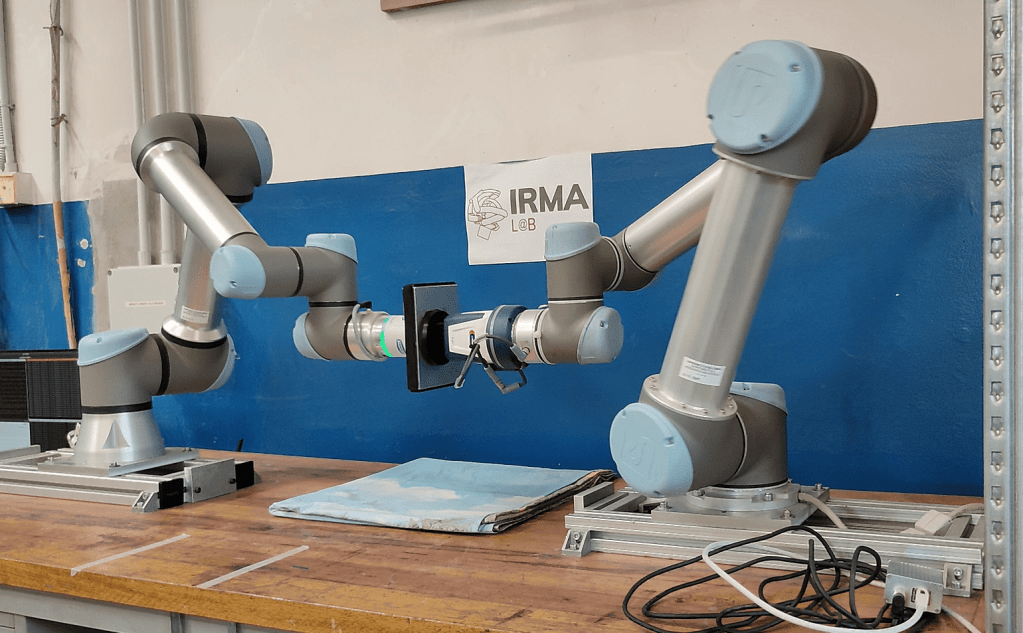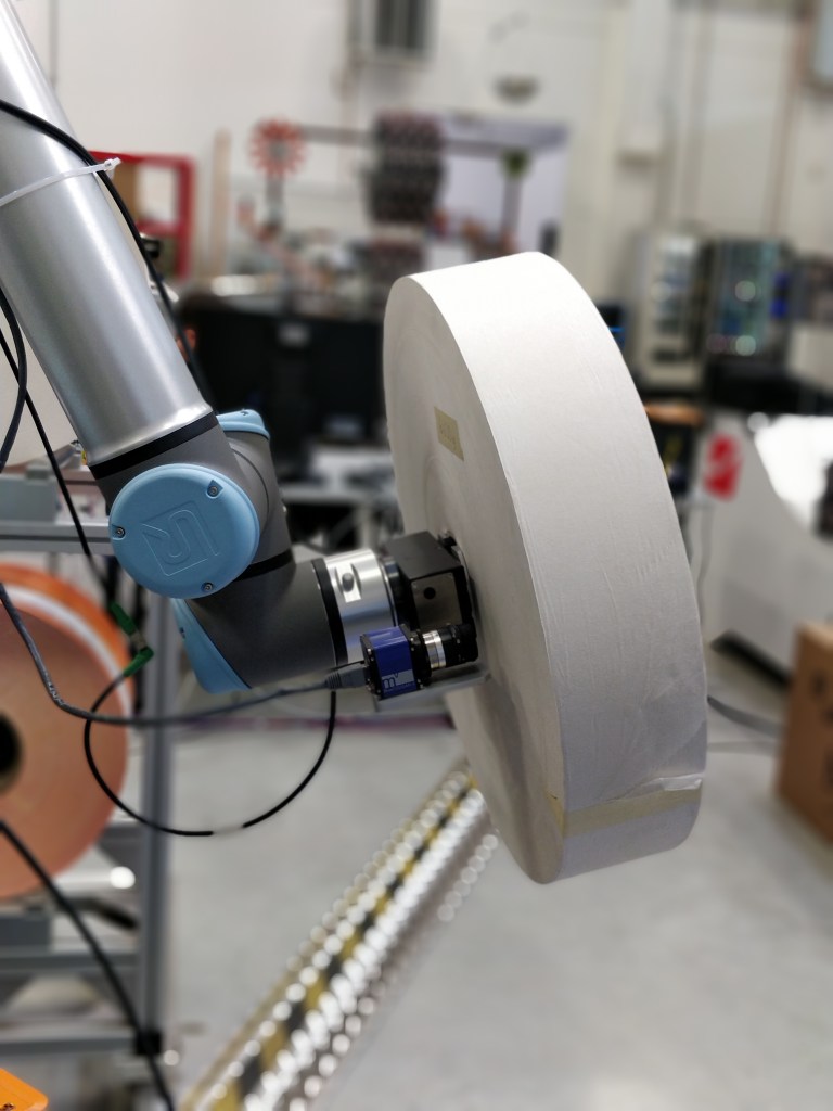 - two UR10e by Universal Robots collaborative robots; the former mounts a 3-finger adaptive gripper by Robotiq to take care of light and sophisticated manipulations, whereas the latter is equipped with an industrial 2D camera and an electrical gripper by Zimmer, and is in charge of inspection/detection tasks and heavy-reel manipulation;