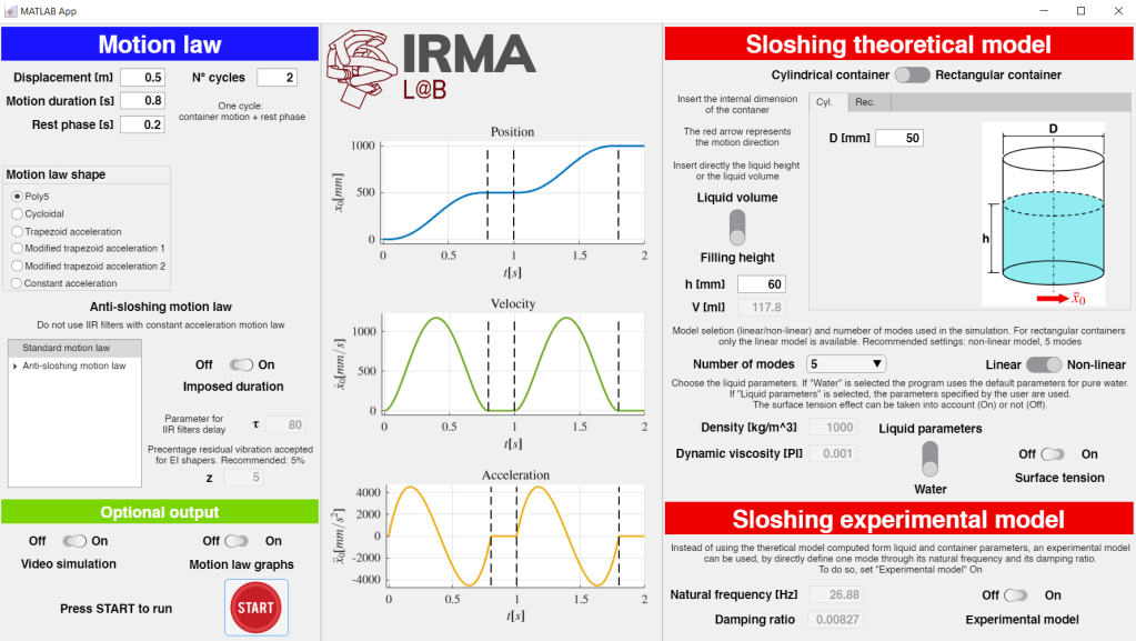 We have developed (through Matlab) a desktop application called ALiSS (Application for Liquid Sloshing Simulation) to execute fast and easy simulations of the liquid behavior in cylindrical and rectangular containers during rectilinear alternate motions. You can require ALiSS by filling out this form and sending it to luca.guagliumi3@unibo.it.